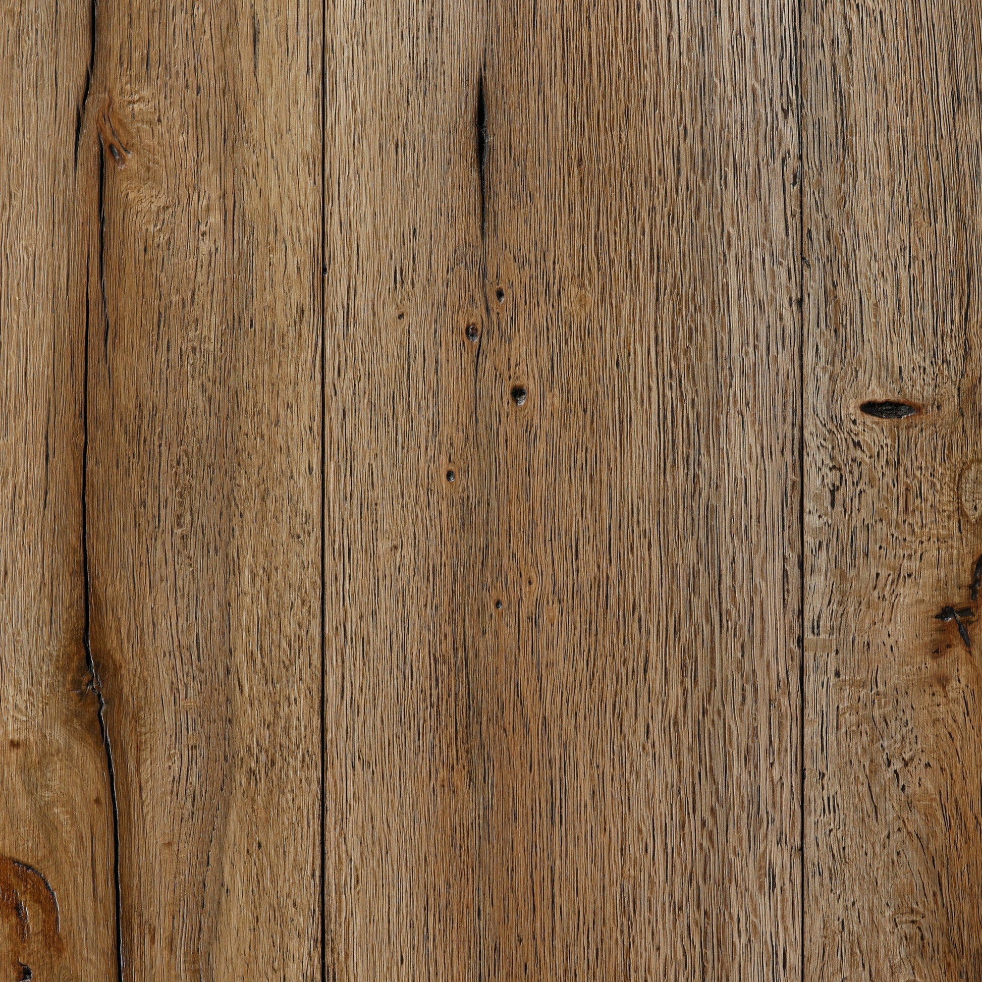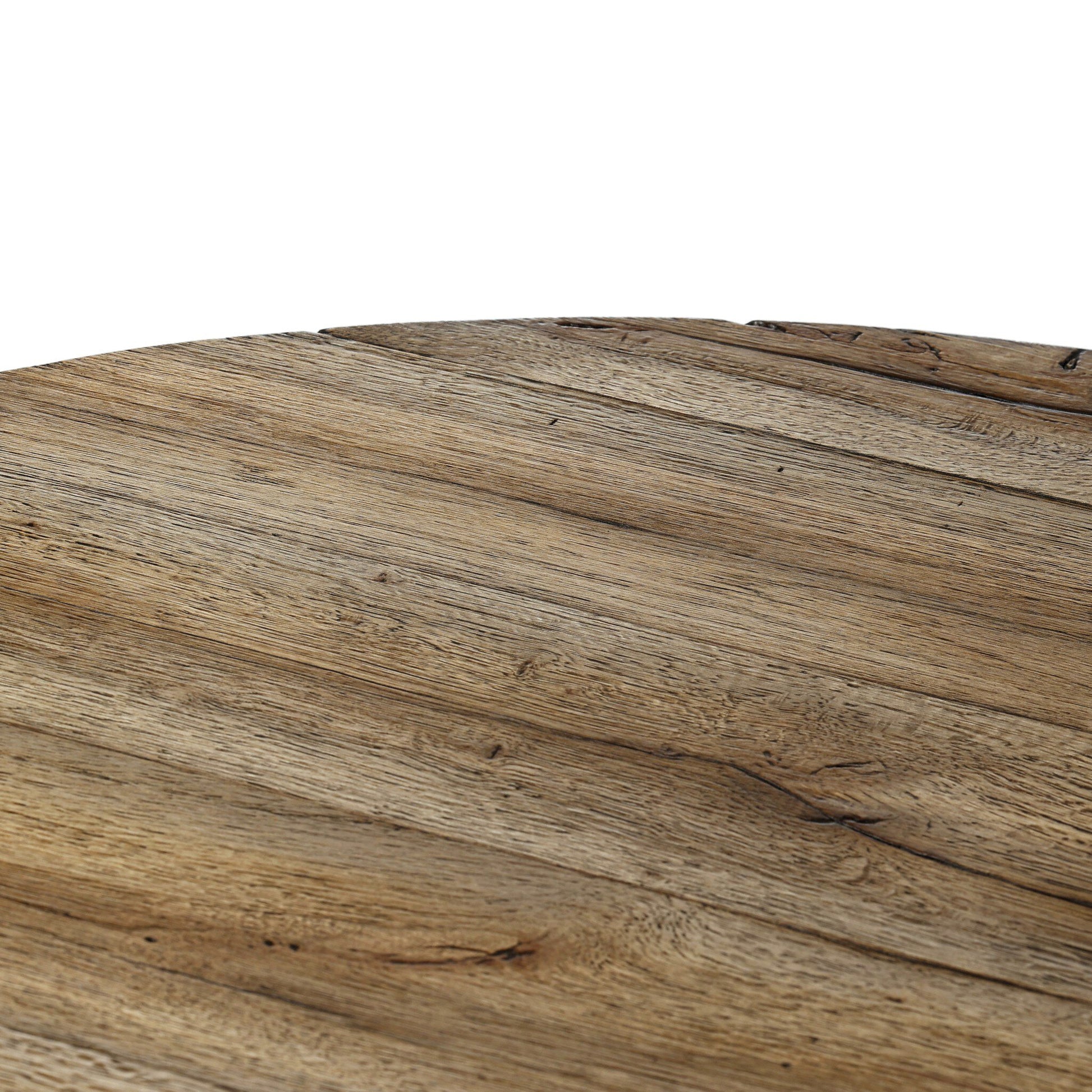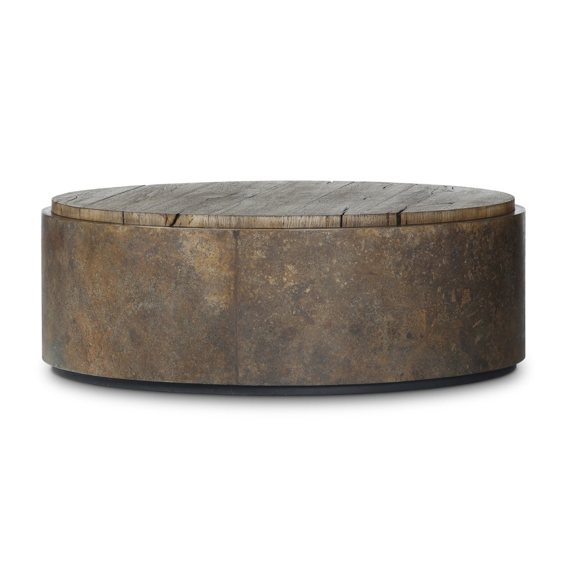 A drum-style table is wrapped in distressed aluminum with a rust finish, for a unique acid-wash effect. Topped with resawn oak which has been sun-bleached and torch-burned for both texture and character.